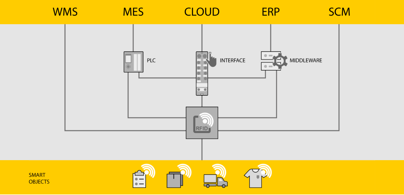 The key requirement for IIoT, the Industrial Internet of Things, is the use of smart industrial components that enable physical objects in production logistics to be present on the Internet. Regardless of whether it is a container with raw materials, components, primary products or finished products – all components can communicate with each other as smart objects in the network when fitted with RFID tags. This turns RFID into a key technology for IIoT.
