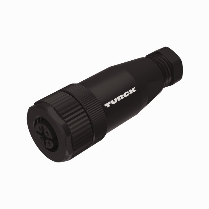 Field-wireable female connector, M12 × 1, straight, 4-pin, screw terminal connection, cable feedthrough 4.0 to 6.0 mm, core cross-section/terminal capacity 0.14 to 0.75 mm², plastic housing, plastic coupling nut |