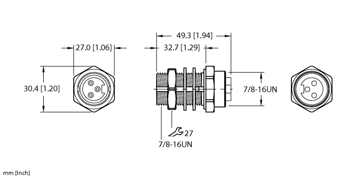 - 7/8″ minifast, Female, Receptacle, 3-pin